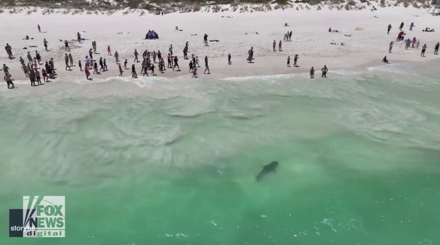 WATCH: DRONE FOOTAGE SHOWS TIGER SHARK SWIMMING SEVERAL FEET FROM BEACHGOERS – AND THEY DON’T KNOW IT