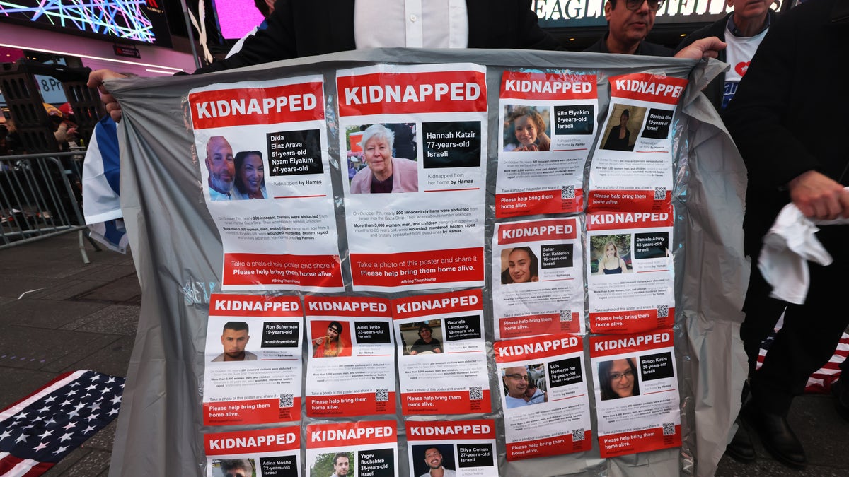 A man holds a banner displaying photos of kidnapped Israelis at a rally in Times Square demanding Hamas free Israeli hostages on Oct. 19, 2023 in New York City. (Photo by Michael M. Santiago/Getty Images)