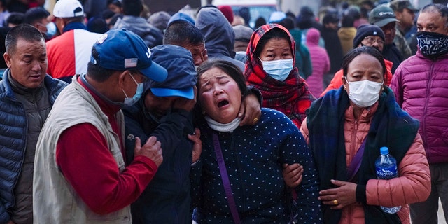A woman cries as the body of a relative, victim of a plane crash, is brought to a hospital in Pokhara, Nepal, Sunday, Jan. 15, 2023.