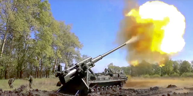In this handout photo released by Russian Defense Ministry Press Service released on Sunday, June 5, a Pion artillery system of the Russian military fires at a target in an undisclosed location in Ukraine. (Russian Defense Ministry Press Service via AP)