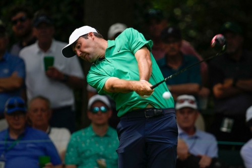 Defending Masters champion Scottie Scheffler hits his tee shot on the seventh hole Thursday.