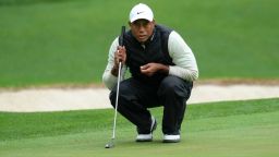 Tiger Woods lines up a putt on the 16th hole during the weather delayed second round of the Masters golf tournament at Augusta National Golf Club on Saturday, April 8, 2023, in Augusta, Ga.